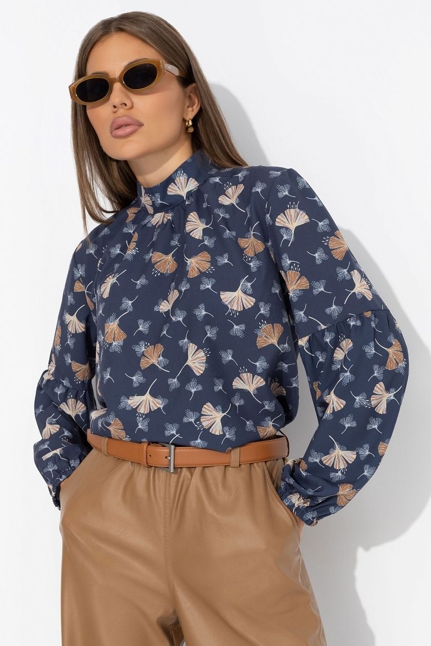Блуза синяя с длинными рукавами от компании Charutti. Модель свободного кроя, выполнена из плательного полотна "Ниагара" с принтом. Горловина оформлена воротником-стойкой. Изделие хорошо смотрится в заправленном виде и навыпуск. Рукава оформлены скрытой резинкой. Блуза хорошо смотрится на любом типе фигуры. Отличный выбор для офисных модниц.