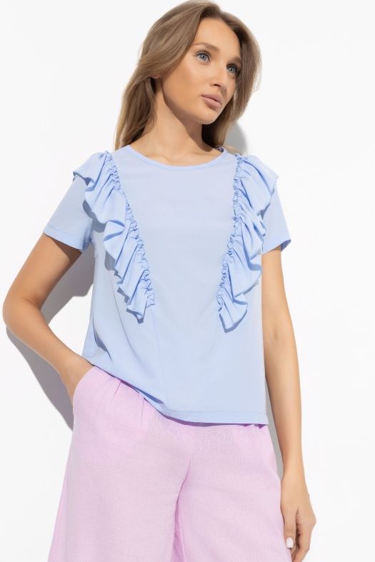Блузка голубая с оборками от компании Charutti. Модель полуприлегающего силуэта, выполнена из ткани софт. Круглый вырез горловины. Втачные короткие рукава. Прекрасное решение для создания стильного образа.