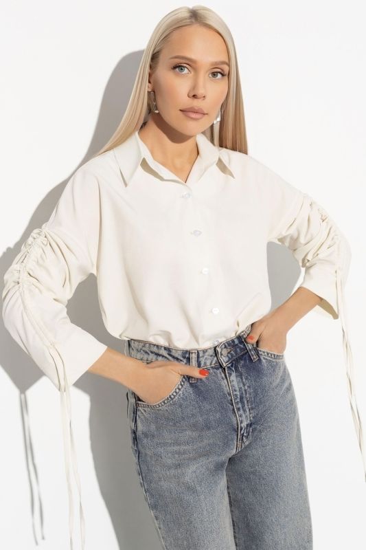 Блузка молочного цвета с кулиской на рукавах от компании Charutti. Модель свободного силуэта, выполнена из блузочной ткани "ниагара". Отложной воротник-стойка. Втачные длинные рукава на манжетах, со спущенной линией плеча. Низ ровной с разрезами по бокам. Идеальный выбор для офисных модниц.