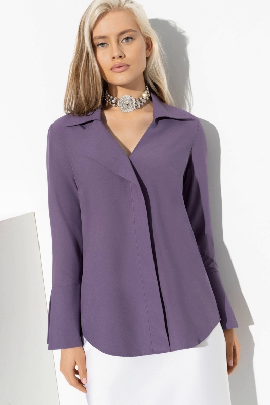 Блузка с длинным рукавом фиолетового цвета от компании Charutti. Модель свободного силуэта, выполнена из полотна «ниагара». V-образный вырез оформлен отложным воротником. По переду выполнена имитация центральной застёжки. Втачные рукава с высокими манжетами. Низ фигурный. Идеальный выбор для городских модниц.