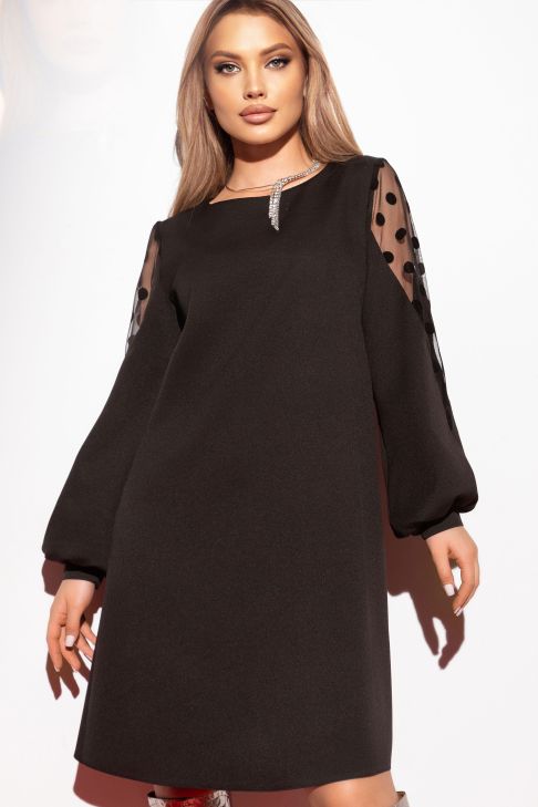 Чёрное женское платье от компании Charutti. Модель расширенного к низу силуэта, выполнена из костюмной ткани "барби" и сетки "флок". Округлый вырез горловины. Втачные длинные рукава собраны на манжету. Низ ровный, без разрезов. Идеальный выбор на каждый день.
