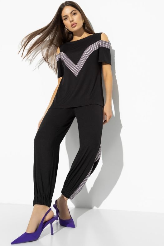 Чёрный костюм с брюками и блузкой от компании Charutti. Модель прямого силуэта, выполнена из трикотажного полотна "рибана жаккард". Блузка с круглым вырезом горловины, короткие рукава с открытыми плечами, низ с разрезами. Брюки с карманами по бокам, низ собран на резинку. Идеальный выбор для создания стильного образа.