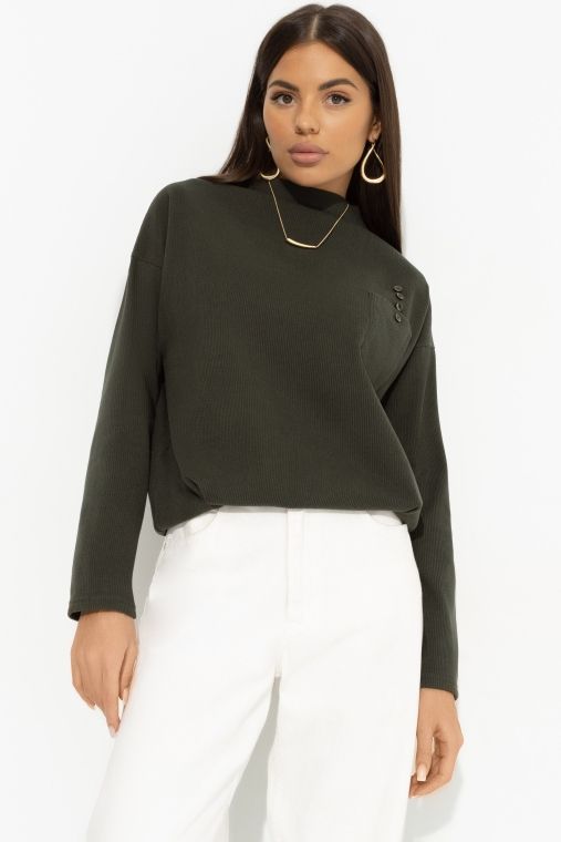 Джемпер зелёный с накладным карманом от компании Charutti. Модель прямого кроя, выполнена из трикотажного полотна "джерси". Горловина оформлена небольшой стойкой. Длинные рукава, спущена линия плеча. Джемпер украшен миниатюрными пуговицами. Изделие хорошо смотрится в заправленном виде и навыпуск.