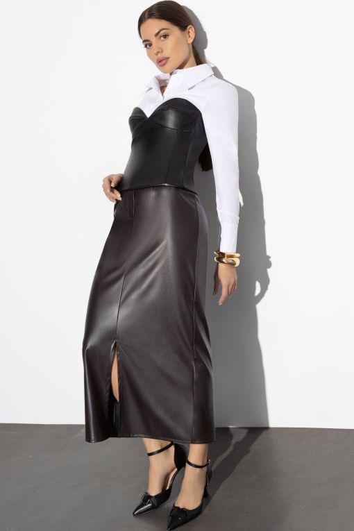 Коричневая юбка из экокожи от компании Charutti. Модель прямого силуэта. Притачной пояс. Застёжка на пуговицу. Низ ровный, спереди разрез. Идеальный выбор для создания женственного образа.