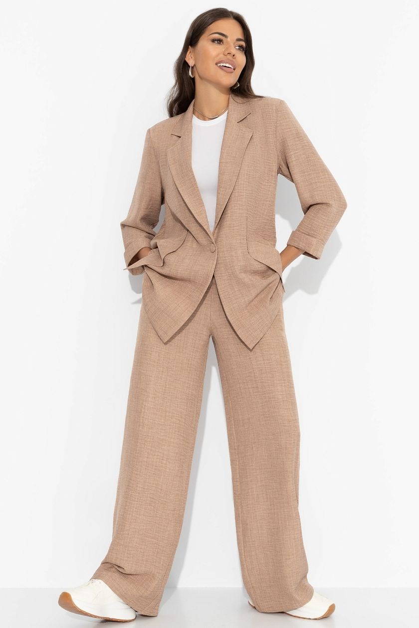 Костюм брючный бежевый из лёгкой ткани от компании Charutti, выполнен из ткани «Аэролён». Костюм состоит из жакета однобортного с лацканами на подплечниках. Прямой крой изделия. Рукав укорочен. Имитация карманов. Брюки прямого кроя. Пояс на резинке. Есть карманы. Стильный вариант для создания женственного образа.