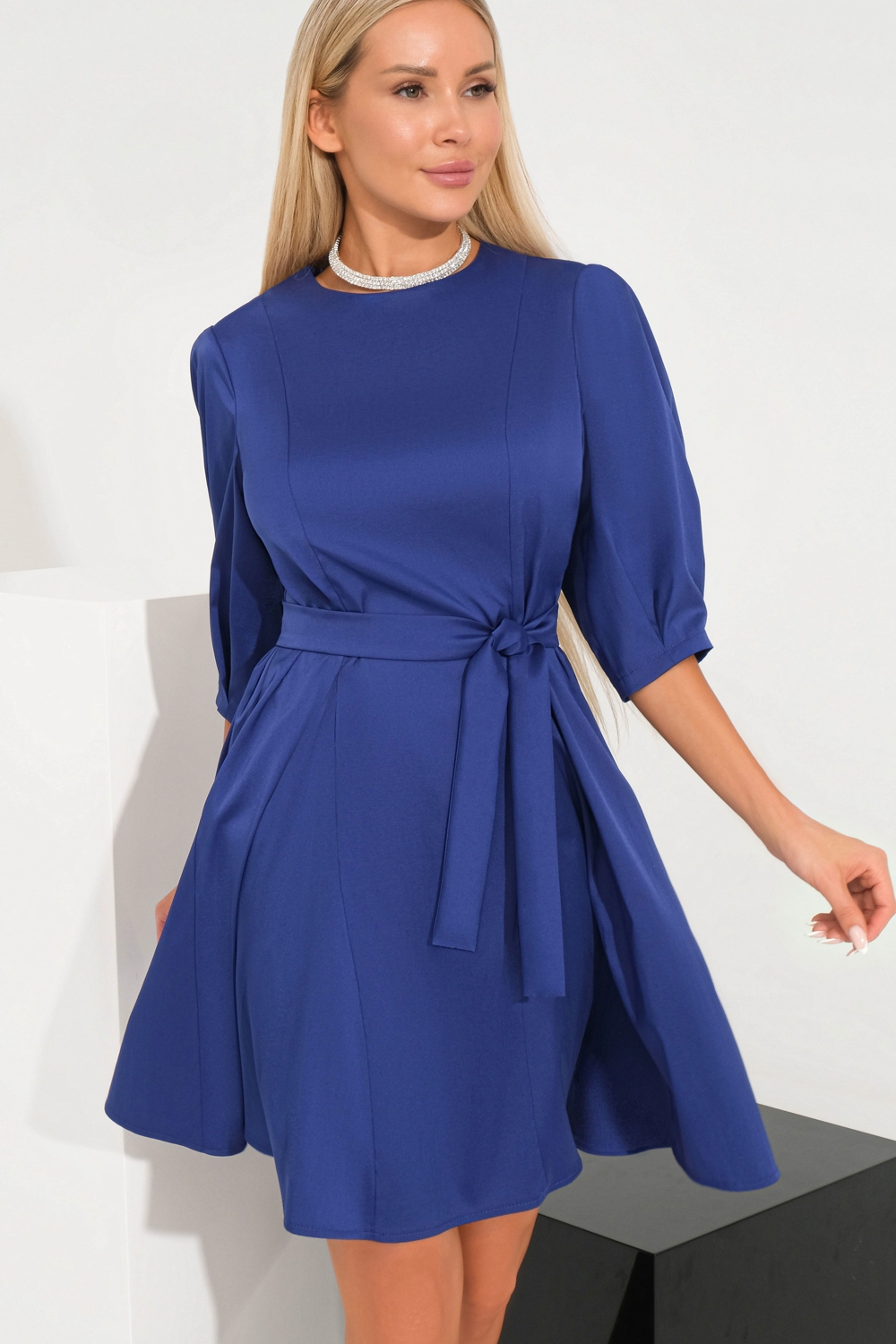 Однотонное женское платье от компании Charutti. Модель свободного силуэта, выполнена из ткани тс сатин в синем цвете. Круглый вырез горловины. Втачные рукава длиной 3/4 на манжетах. Поя из основной ткани входит в комплект. По спинке застёжка на пуговицу. Идеальный выбор для Вашего женственного гардероба.