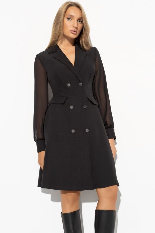 Платье чёрное на запах с рукавами из шифона от компании Charutti. Модель полуприлегающего силуэта, выполнена из костюмного полотна "барби". V-образный вырез горловины, дополнен лацканами. Втачной, длинный рукав на манжете. Спереди имитация карманов, застёжка на пуговицы. Низ ровный, без разрезов. Это Ваш отличный образ, в котором вы всегда чувствуете себя уверенно.