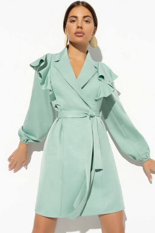 Платье с притачными воланами от компании Charutti. Модель прямого силуэта на запах изготовлена из ткани гальяно, ментолового цвета. Отложной воротник с лацканами, втачные длинные рукава но низу оформлены резинкой. Изделие с поясом из основной ткани. Идеальный выбор на каждый день.