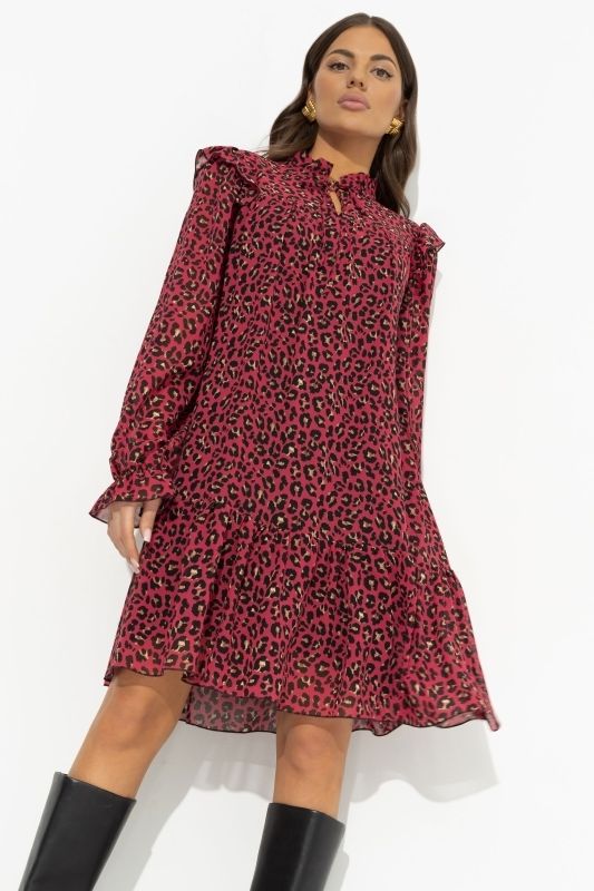 Платье шифоновое красное с принтом от компании Charutti. Модель свободного силуэта, на трикотажном подкладе. По переду вырез капелька дополнен завязками, Рукава втачные, длинные. Платье декорировано аккуратными рюшами. Идеальный выбор для создания женственного образа.