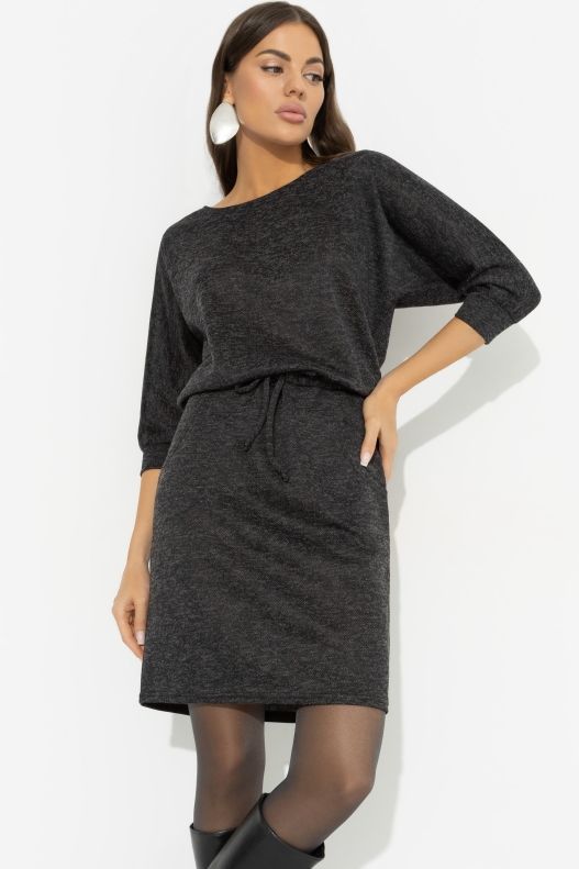 Платье трикотажное чёрного цвета с карманами от бренда Charutti. Модель полуприлегающего силуэта, выполнена из полотна «меланж». Круглый вырез горловины. Имитация сочетания юбки и джемпера. Есть завязки на талии. Линия плеча спущена. Рукава цельнокроеные укороченные на манжете. Идеальный выбор для городских модниц. Ремень из экокожи в комплект не входит, продается отдельно.