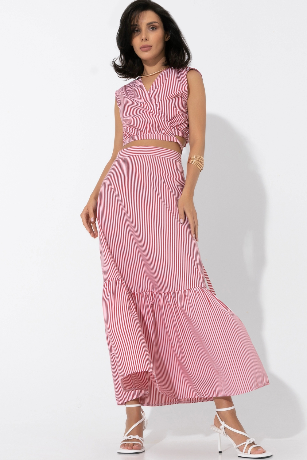 Прекрасный юбочный комплект от компании Charutti, выполнен из ткани "полоска плательная" в красном цвете, состоит из топа и юбки. Топ полуприлегающего силуэта, с V-образным вырезом горловины на запах, без рукавов, низ на притачной манжете с длинными завязками. Юбка свободного силуэта, с притачным поясом и воланом по низу. Идеальный выбор для Вашего летнего гардероба.