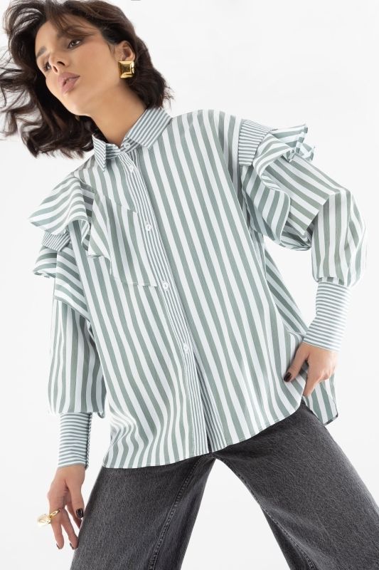 Рубашка дизайнерская в полоску от компании Charutti. Модель свободного силуэта, выполнена из рубашечной ткани "поливискоза". Горловина оформлена воротником-стойкой. Втачные длинные рукава на манжетах, дополнены объёмными рюшами. Центральная застёжка на пуговицы. Низ ассиметричный, спинка длиннее, по бокам разрезы. Идеальный выбор для создания неповторимого образа. Ремень из экокожи в комплект не входит, продается отдельно.