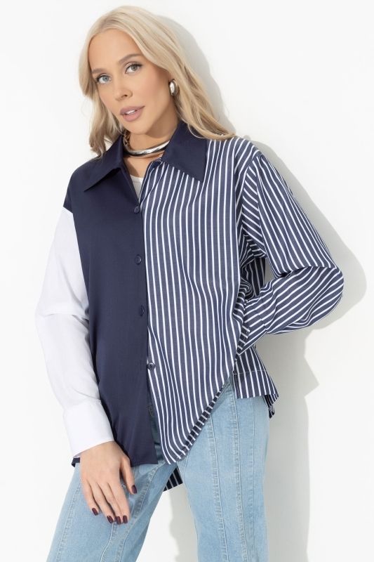Рубашка комбинированная с длинными рукавами от компании Charutti. Модель прямого силуэта, выполнена из полоска рубашечная», «сатин тс», «поплин». Отложной воротник-стойка. Втачные рукава на манжетах, со спущенной линией плеча. Центральная застёжка на петли и пуговицы. Идеальный выбор для городских модниц.
