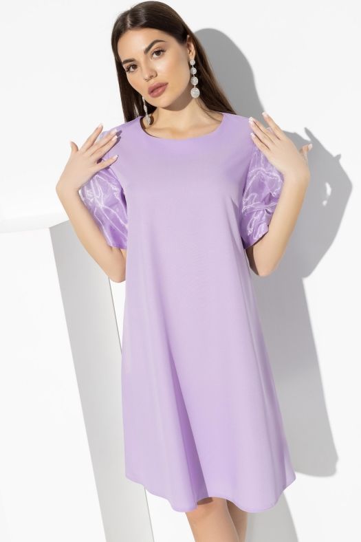 Сиреневое платье с рукавами из органзы от бренда Charutti. Модель А-силуэта, выполнена из плательной ткани "диагональ". Круглый вырез горловины. Втачные короткие рукава. Идеальный выбор для создания женственного образа.