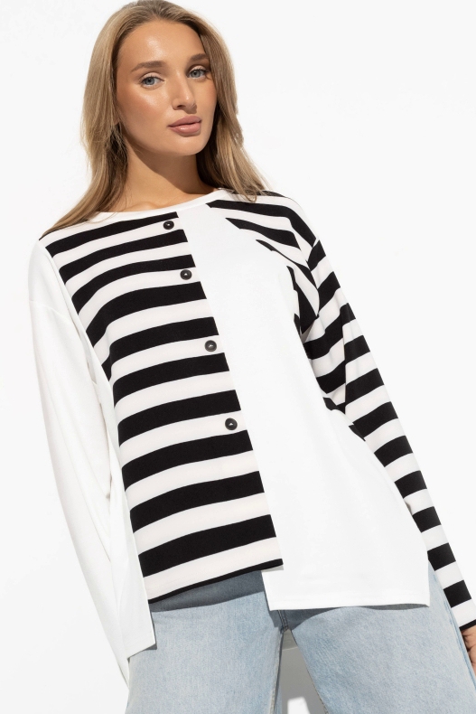 Свитшот белый с асимметричным низом от компании Charutti. Модель прямого силуэта, выполнена из трикотажа "милано" и костюмной ткани "мартьяно". Круглый вырез горловины. Втачные длинные рукава, со спущенной линией плеча. Идеальный выбор на каждый день.