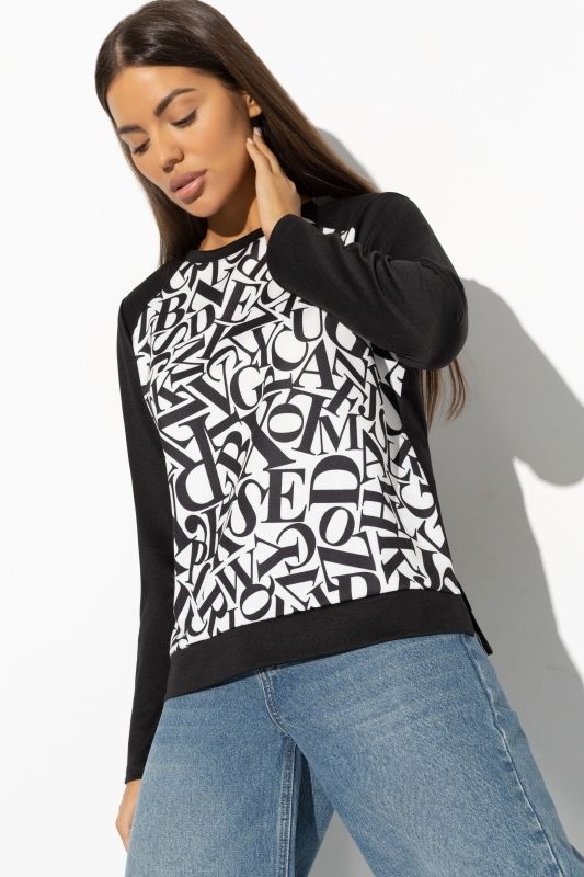 Свитшот трикотажный чёрный с контрастным принтом от компании Charutti. Модель прямого силуэта, круглый вырез горловины. Длинные рукава на манжетах. Выполнен из полотна "милано". Деликатные разрезы по бокам изделия. Прекрасное решение для создания стильного образа.