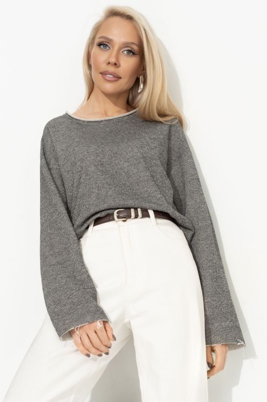 Свитшот трикотажный серый с люрексом от компании Charutti. Модель прямого силуэта, удлиненный. Эффект необработанного края по подолу. Плотный фактурный материал - футер трехнитка. Круглый вырез горловины, длинные рукава. Изделие хорошо смотрится в заправленном виде и навыпуск.