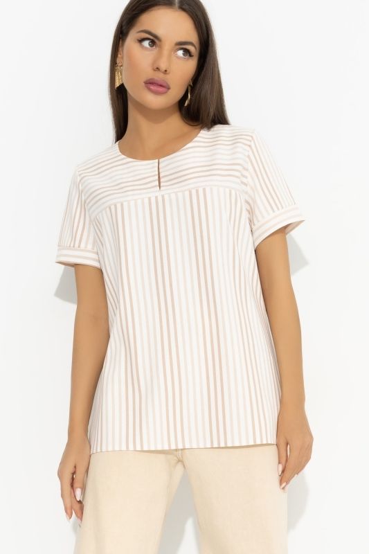Туника бежевая льняная в полоску от компании Charutti. Модель прямого силуэта, круглый вырез горловины. Низ ровный, по бокам разрезы. Идеальный выбор для создания женственного образа.