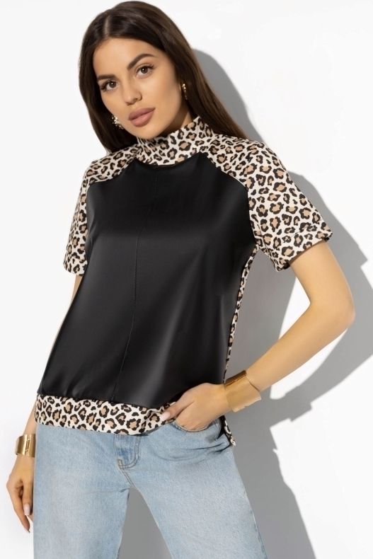 Водолазка из комбинированной ткани с принтом от компании Charutti. Модель прямого силуэта, выполнена из двух видов ткани трикотаж «милано» и «экокожа». Воротник-стойка. Втачные короткие рукава на манжетах. Низ асимметричный с разрезами, на манжете. Это Ваш отличный образ, в котором вы всегда чувствуете себя уверенно.