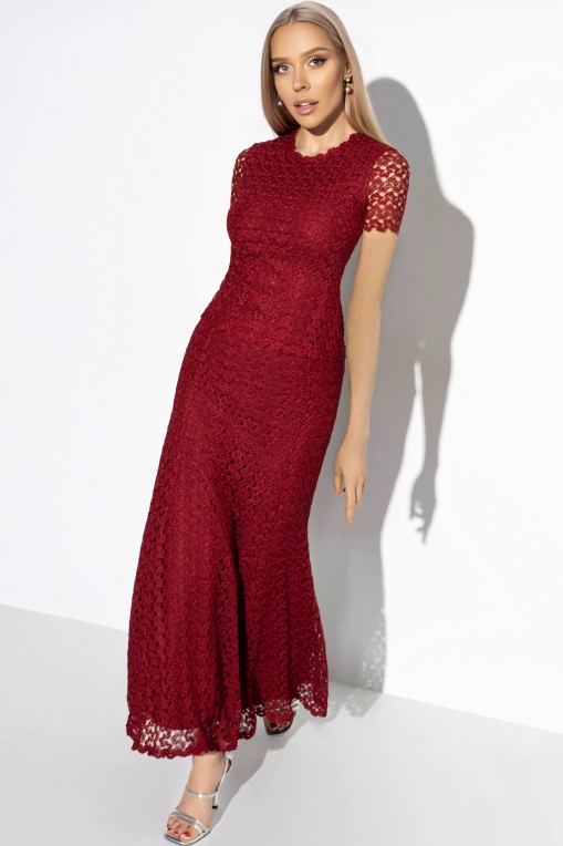 Юбка бордового цвета из плетёного кружева от компании Charutti. Модель кроя годе на трикотажном подкладе. Притачной пояс. Идеальный выбор для городских модниц.