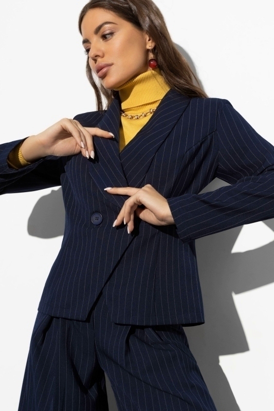 Жакет синий на пуговицах в полоску от компании Charutti. Модель полуприлегающего силуэта, выполнена из костюмной ткани. V-образный вырез горловины с шалевым воротником. Втачные длинные рукава. Без подклада. Двубортная застёжка. Идеальный выбор для создания женственного образа.