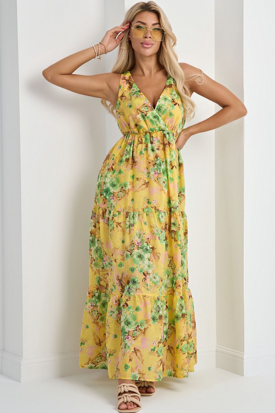 Платье длинное жёлтое на запах от компании Jetty. Модель с расклешенной ярусной юбкой., выполнена из хлопкового полотна с цветочным принтом. По переду V-образный. Без рукавов. Платье на подкладе. Линия талии на резинке. Идеальный выбор для создания женственного образа.