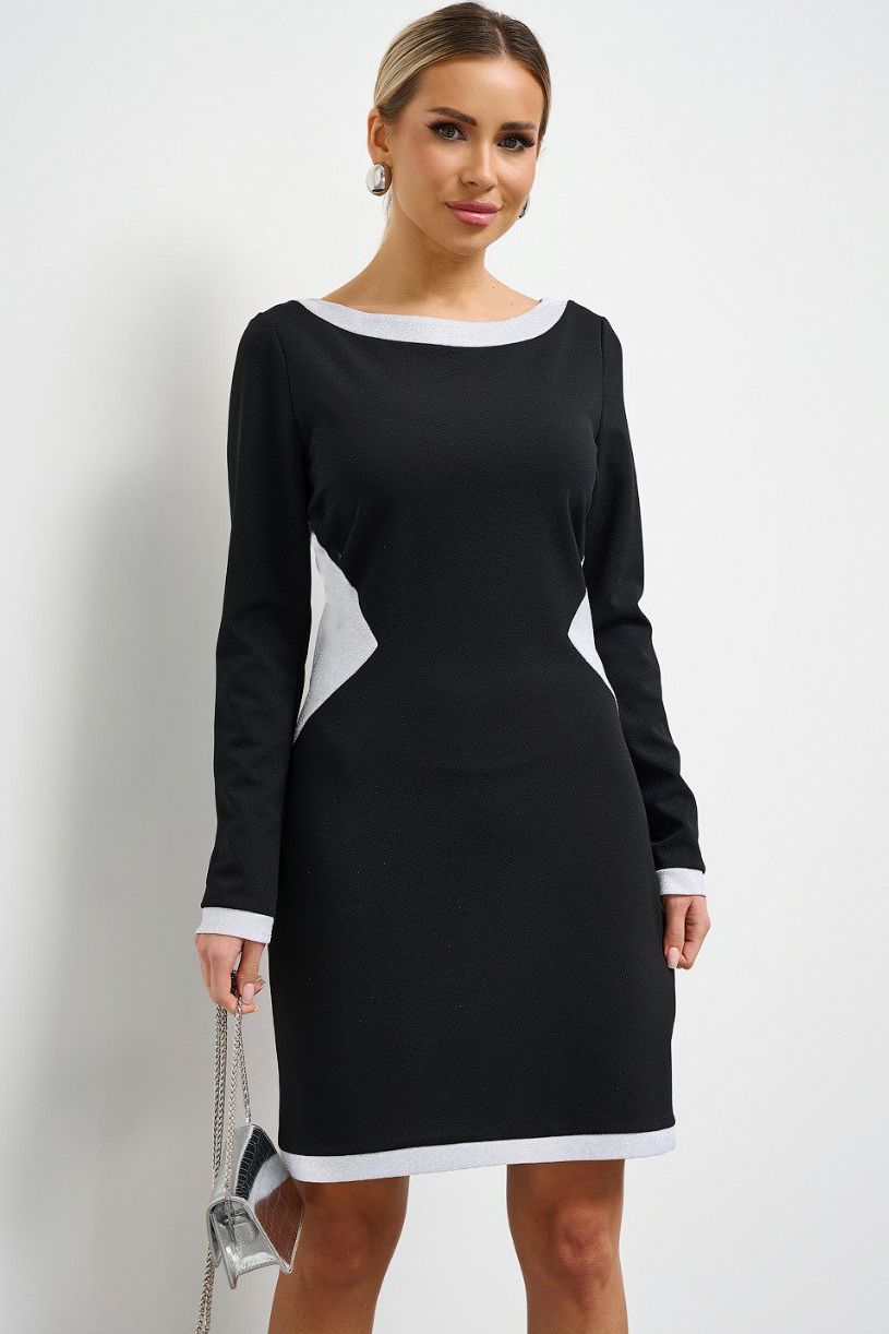 Платье-футляр трикотажное чёрное от производителя Jetty. Модель полуприлегающего силуэта, горловина оформлена круглым вырезом. Втачные длинные рукава. По бокам изделия , горловине, низу и низу рукавов вставки тканью контрастного цвета. Боковые вставки идеально подчеркивают и корректируют силуэт. Идеальный выбор на каждый день.