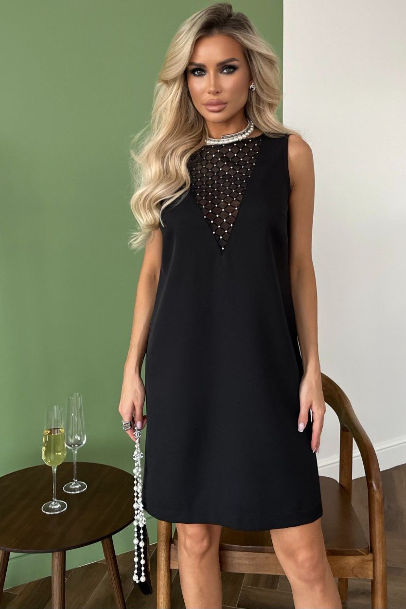 Платье короткое чёрное с декором в виде страз от производителя Jetty. Модель прямого силуэта, выполнена из костюмной ткани. V-образный вырез горловины, отделка из сетки. Без рукавов, застёжки и подклада. Идеальный выбор для создания вечернего образа.