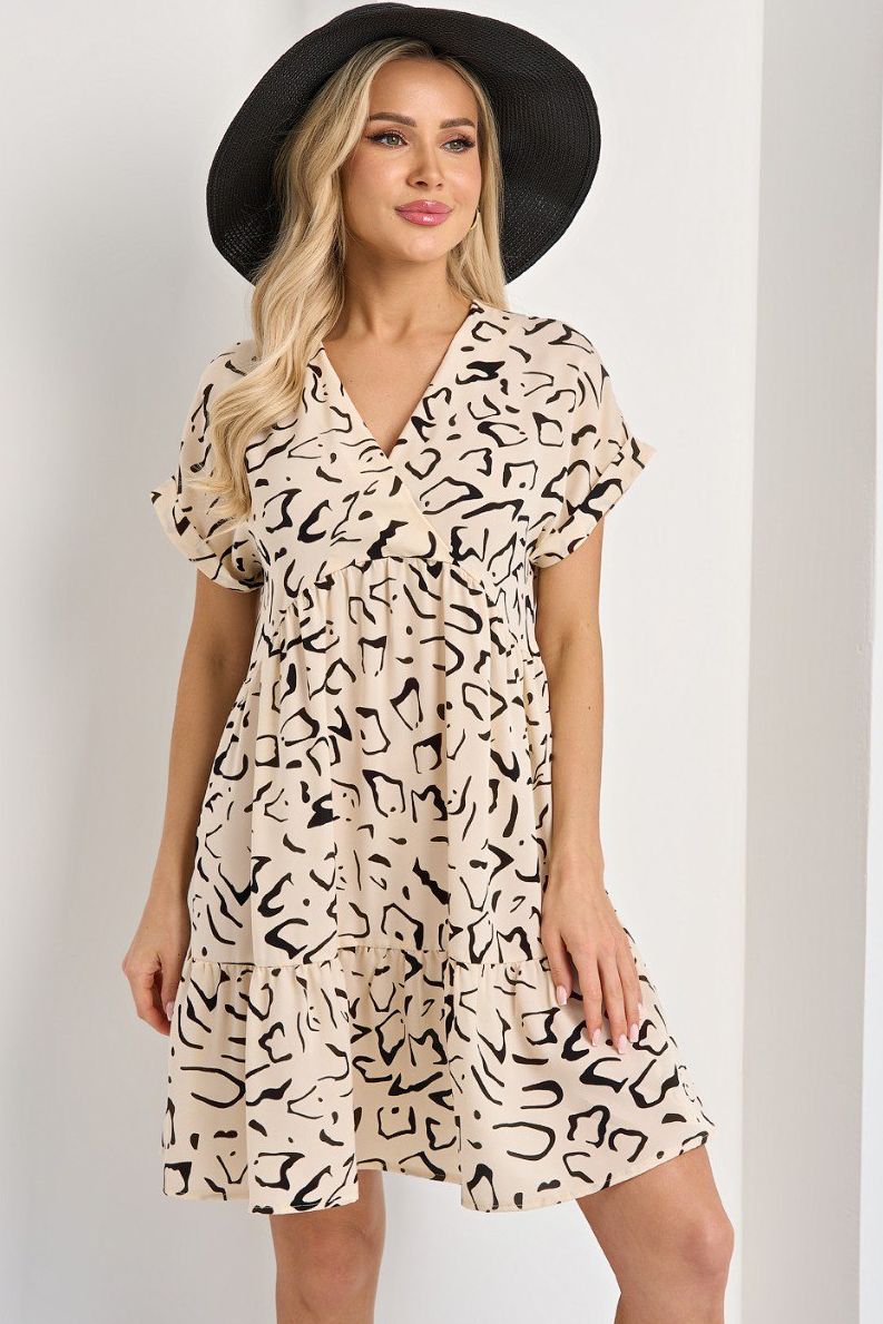 Платье короткое светло-бежевое с воланом от компании Jetty. Модель свободного силуэта из выполнена из плательной ткани с принтом. V-образный вырез горловины с запахом. Отрезное под линией груди. Короткие рукава с отворотом. Идеальный выбор для создания женственного образа.