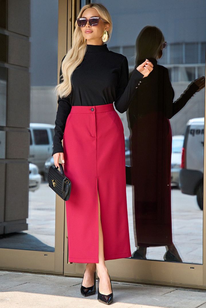 Юбка длинная малинового цвета с карманами от бренда Jetty. Модель По переду средний шов с с разрезом по центру, выполнена из костюмного полотна. Изделие с притачным поясом. Застежка на молнию и пуговицу. Идеальный выбор для создания стильного образа.
