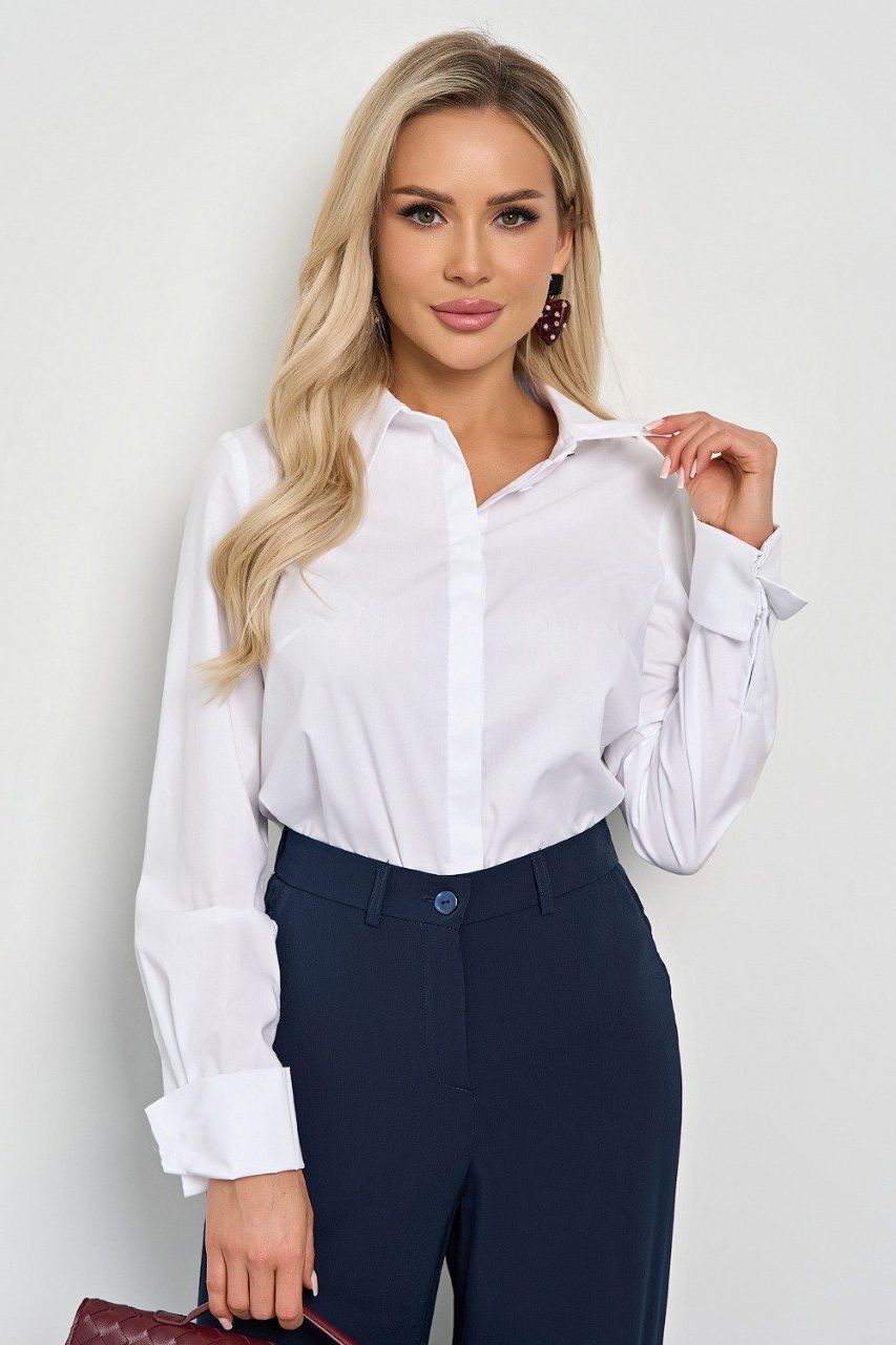 Блузка белая с длинными рукавами от компании Jetty. Модель полуприлегающего силуэта, выполнена из хлопкового полотна. Отложной воротник-стойка. Втачные рукава на высокой манжете с пуговицей. По переду изделия расположена притачная планка. Идеальный выбор для офисных модниц.