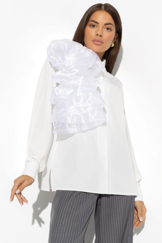 Блузка белая с объёмным декором из органзы от компании Charutti. Модель прямого силуэта, выполнена из плательной ткани "ниагара". Отложной воротник-стойка. Втачные длинные рукава на манжетах. Центральная застёжка на петли и пуговицы. Низ с разрезами по бокам. Идеальный выбор для создания неповторимого образа. Объемный декор пришит.