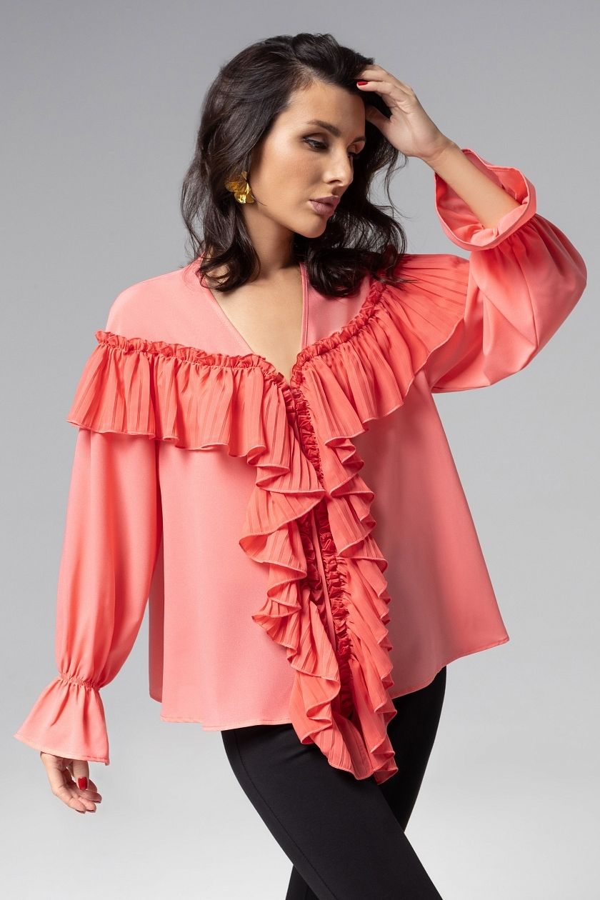 Блузка нарядная розовая с рюшами от компании Charutti. Модель свободного силуэта, выполнена из креп-шифона. V-образный вырез горловины. Длинный рукав. Рюши из шифона.Прекрасное решение для создания романтичного образа.