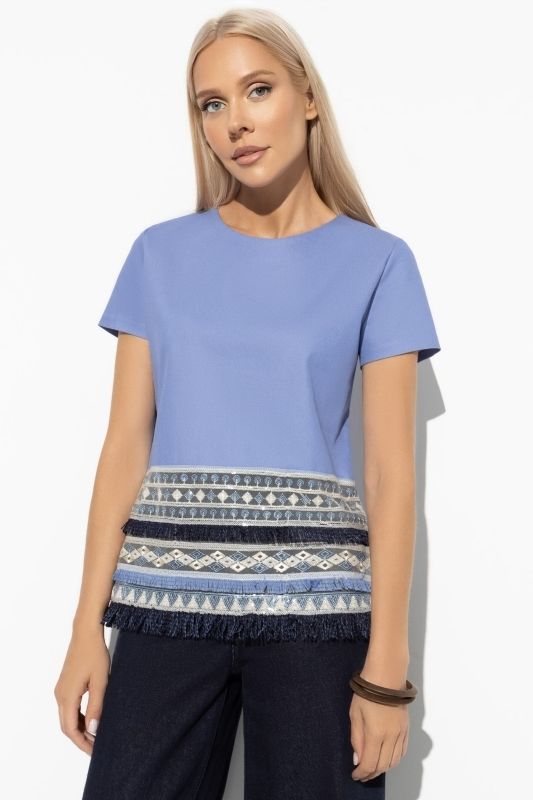 Блуза из денима с вышивкой из паеток и бахромы 50 размера