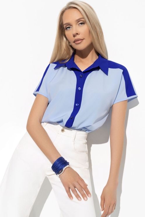 Блузка голубая с контрастной отделкой на пуговицах от компании Charutti. Модель прямого силуэта, выполнена из блузочной ткани "ниагара". Отложной воротник-стойка. Цельнокроеные короткие рукава на манжетах. Центральная застёжка на пуговицы. Идеальный выбор на каждый день.