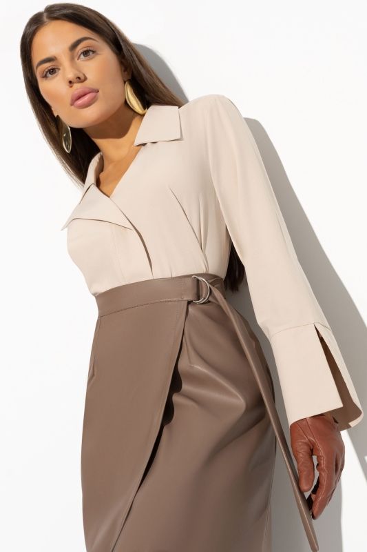 Блуза бежевая с разрезами на рукавах от компании Charutti. Модель свободного силуэта, выполнена из плательного полотна "ниагара". V-образным вырез горловины с отложным воротником. Срытая линия пуговиц. Рукава длинные втачные. Отличный выбор для офисных модниц.