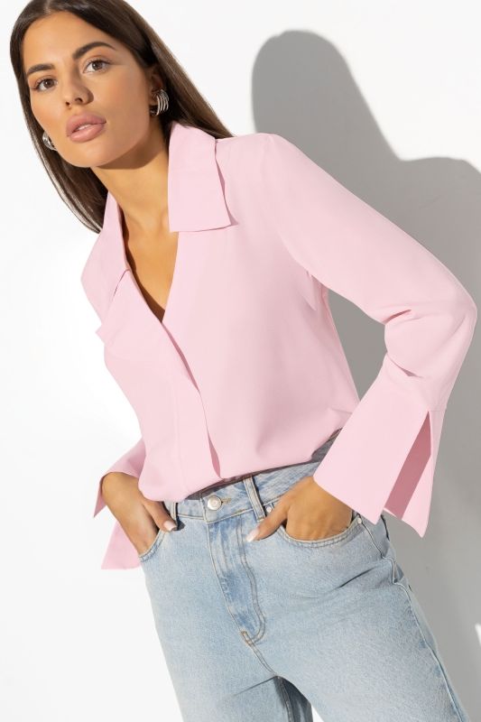 Блуза розовая с разрезами на рукавах от компании Charutti. Модель свободного силуэта, выполнена из плательного полотна "ниагара". V-образным вырез горловины с отложным воротником. Срытая линия пуговиц. Рукава длинные втачные. Отличный выбор для офисных модниц.