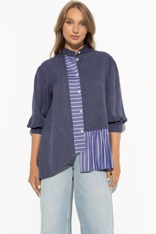 Рубашка синяя комбинированная от компании Charutti. Модель свободного силуэта, выполнена из плательной тканм «кларис» и «джинса полоска». Горловина оформлена воротником-стойкой. Втачные укороченные рукава на резинке. Центральная застёжка на пуговицы.Низ ассиметричный, фигурный. Идеальный выбор для создания неповторимого образа.