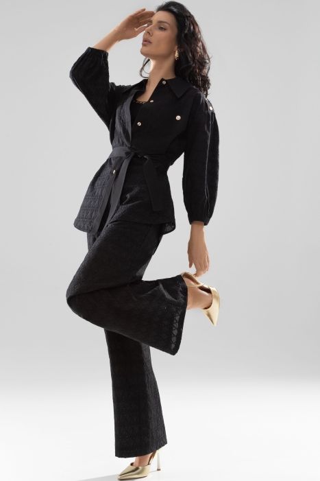 Брюки чёрные широкие от компании Charutti. Модель прямого силуэта, выполнена из «батиста с вышивкой» и «штапеля», на «трикотажном подкладе», притачной пояс на резинке с завязками. Идеальный выбор для городских модниц.