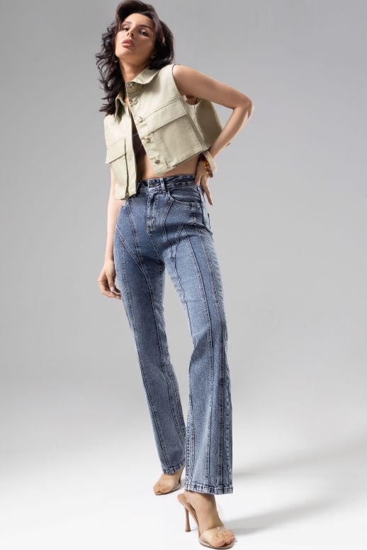 Джинсы женские прямые от бренда Charutti, выполнены из джинсы голубого цвета. Классическая застёжка гульфик и пуговицы. По бокам и спинке функциональные карманы. Шлёвки под ремень. Идеальный выбор для городских модниц.