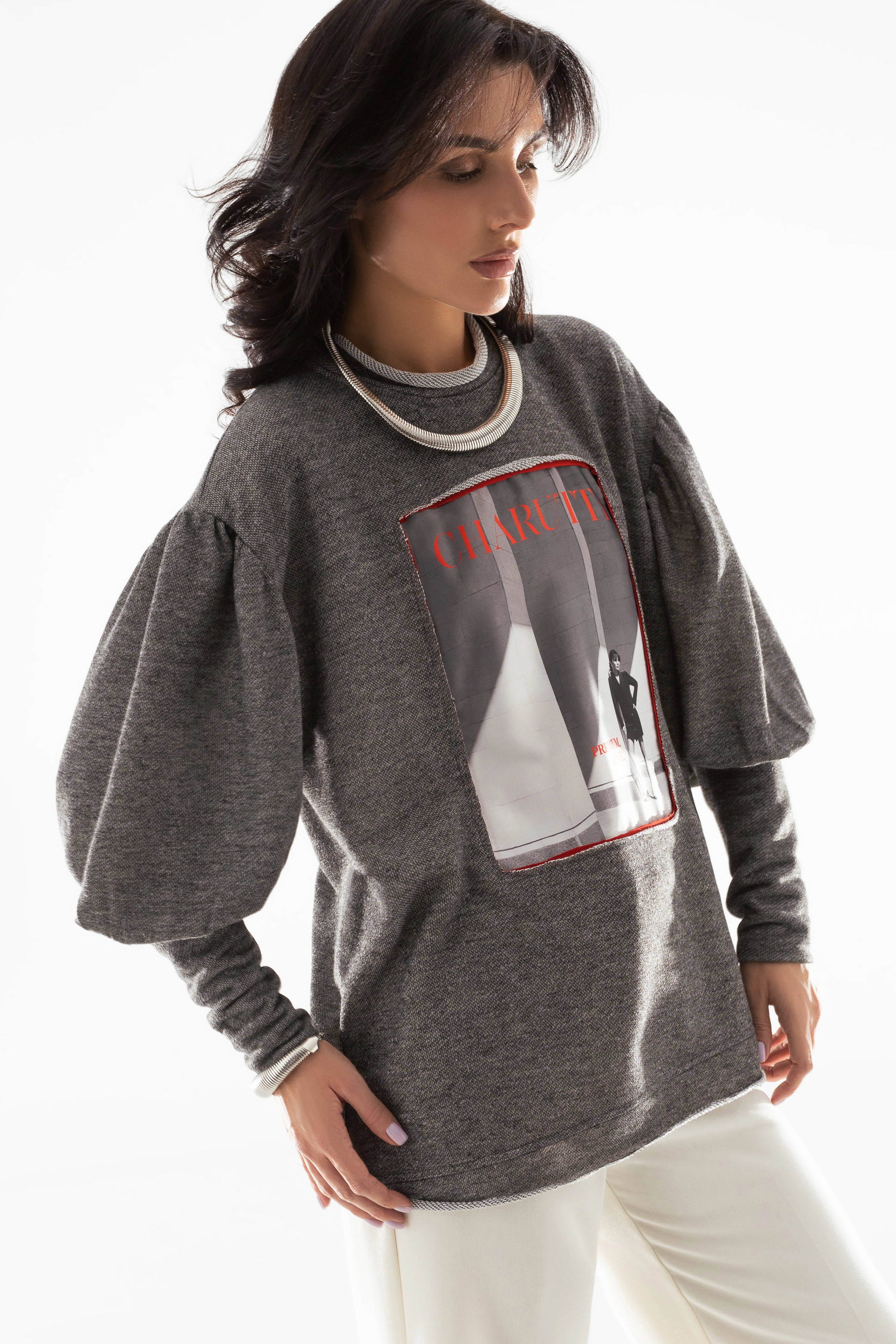 Серый свитшот из футера с объёмными рукавами