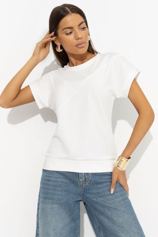 Футболка белая трикотажная от компании Charutti. Модель свободного силуэта. Линия плеча спущена. Материал изделия текстурный. Круглый вырез горловины. Хорошо смотрится в заправленном виде и навыпуск. Идеальный выбор для создания женственного образа.