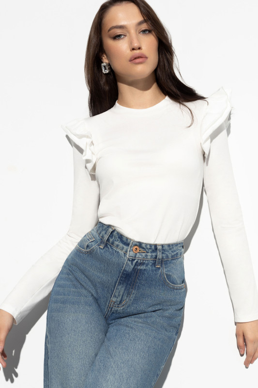Лонгслив с длинными рукавами от компании Charutti. Модель полуприлегающего силуэта, выполнена из трикотажного полотна "кулирка" в молочном цвете. Круглый вырез горловины. Втачные рукава с оборками. Идеальный выбор на каждый день.