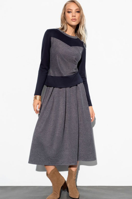 Трикотажный костюм с юбкой и блузкой от компании Charutti, выполнен полотна "жаккард и нейлон-рома" в синем цвете. Блузка полуприлегающего силуэта, с круглым вырезом горловины, втачные длинными рукавами. Юбка рсклешённого силуэта. Идеальный выбор для Вашего стильного гардероба.
