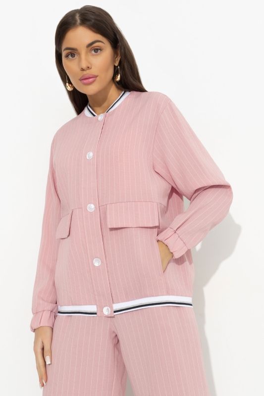 Бомбер розовый в полоску на пуговицах от компании Charutti. Модель свободного кроя, выполнена из костюмной ткани «Кадиллак». Изделие с имитацией накладных карманов по передней части. Подол и ворот изделия оформлены трикотажной резинкой. Рукава также оформлены широкой скрытой резинкой. Стильный вариант для создания модного образа.