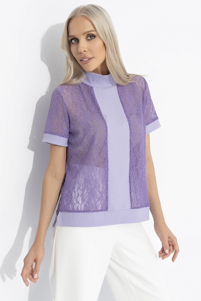 Водолазка сиреневая комбинированная с кружевом от компании Charutti. Модель прямого силуэта, воротник-стойка. Втачные короткие рукава на манжетах. Низ асимметричный с разрезами, на манжете. Это Ваш отличный образ, в котором вы всегда чувствуете себя уверенно.