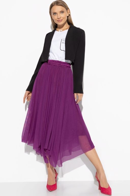 Сиреневая юбка из сетки на подкладе из трикотажа «вискоза» и «сатин креша» от компании Charutti. Модель свободного силуэта. Притачной пояс-резинка. Идеальный выбор для создания стильного образа.