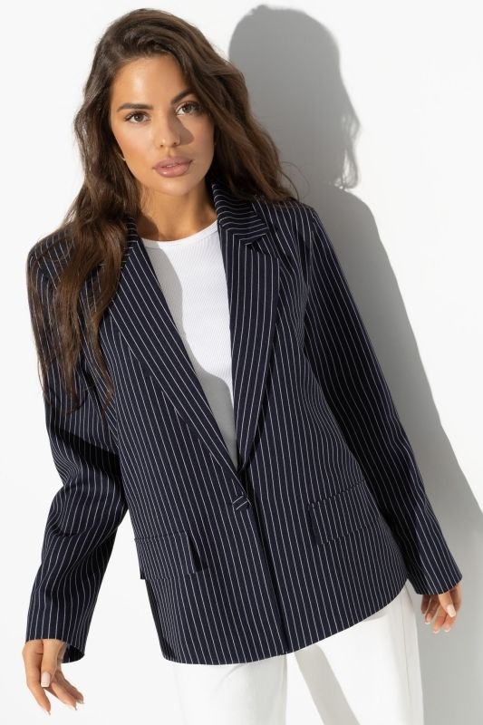 Жакет синий в полоску с подплечниками от компании Charutti. Модель прямого силуэта, выполнена из костюмного полотна "туран". V-образный вырез горловины с английским воротником. Втачные длинные рукава. По переду застёжка на пуговицу и клапаны. Имитация карманов. Жакет на подкладочной ткани «таффета». Идеальный выбор для Вашего стильного гардероба.