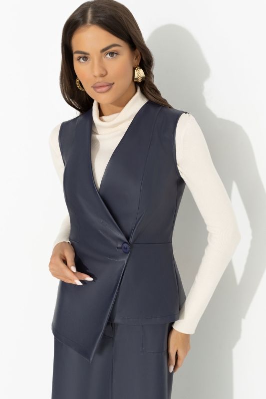 Жилет синий из экокожи от компании Charutti. Модель приталенного силуэта, V-образный вырез горловины. Однобортный, без лацканов. Асимметричный крой подола изделия. Прекрасное решение для создания стильного образа.